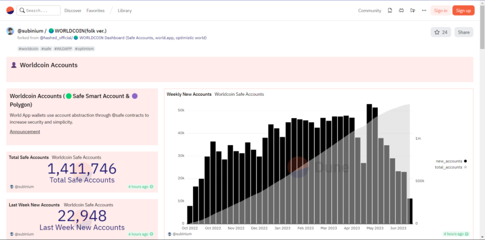 该看板统计了 Worldcoin 账户目前的总用户量、每周增长用户、交易量等数据,帮助用户更加清晰地了解这个有点陌生的项目。