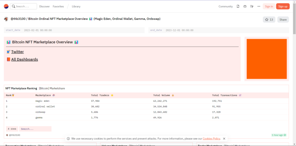 这个看板关注的是比特币生态的 NFT 数据,包括 NFT 市场的排名、每日数据、每周数据等等。