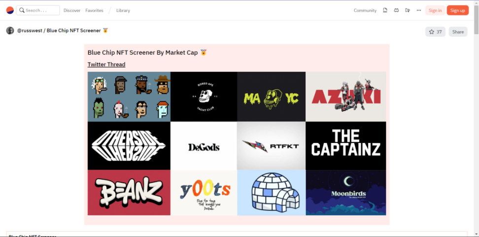 该看板收集了蓝筹 NFT 的相关数据,例如 CryptoPunks 、BAYC、 Doodles 等,既有整个蓝筹 NFT 地板价排名与价格变化,也有针对每个 NFT 项目单独的图表分析。