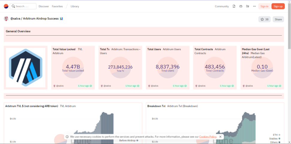 这是 Arbitrum 生态的数据看板,尽管 Arbitrum 已经发放了空投,但是作为 L2 的龙头,仍然是被大家极力看好,那么它的生态数据自然也就成了不可忽视的一部分。