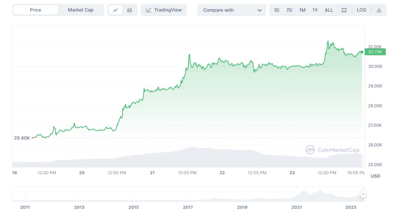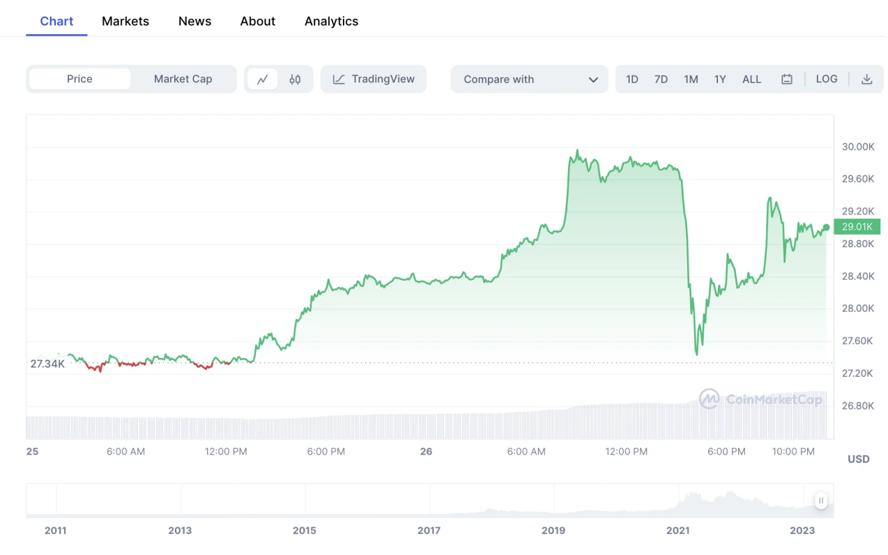在申请消息发布之后,根据 Coinmarketcap 数据,当日比特币出现小额涨幅,但在次日出现较大波动,曾一度靠近 30, 000 美元,但之后又回落至 27, 000 美元左右,最终稳定在 29200 左右,较消息发布之前涨幅为 6.9% 。