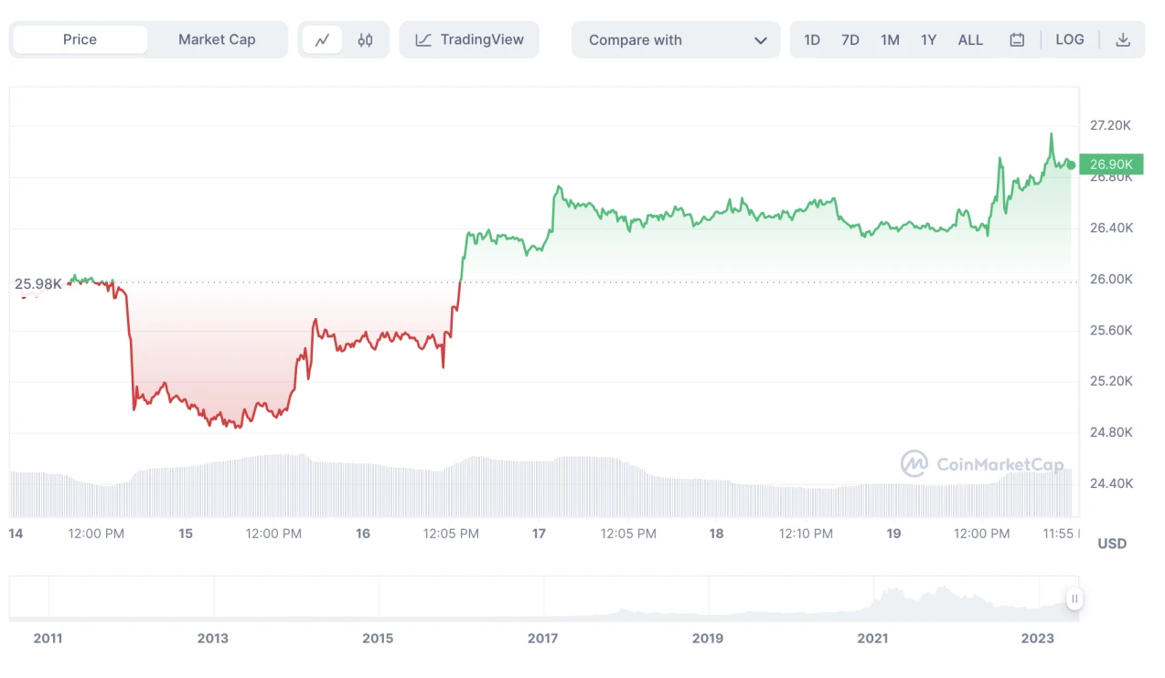 在贝莱德提交申请之前,比特币价格一度在 25000 左右波动,但在消息发布之后出现了直线上涨。15 日的单日涨幅并不大,仅为 2% ;但之后便一路走高,在 19 日站上 27000 美元。