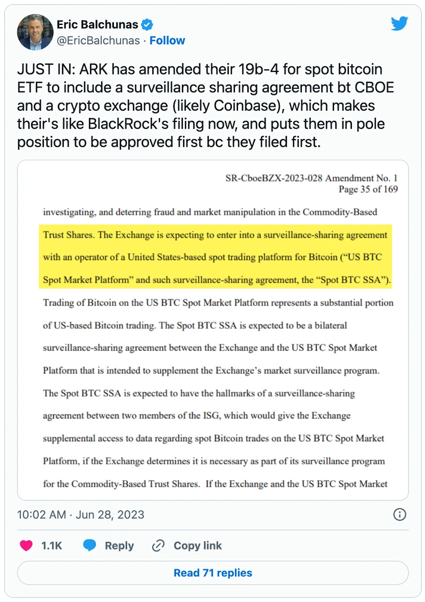 四月份的申请中并没有包含贝莱德和富达投资的申请所包含的监测共享协议,而这可能是 SEC 是否批准的核心。因此,在 6 月 28 日,ARK Invest 已经修改了其现货比特币交易所交易基金的申请文件,以包括一个类似于贝莱德的监控共享协议,涉及分享有关市场交易活动、结算活动和客户身份的信息,以防范市场操纵的可能性。