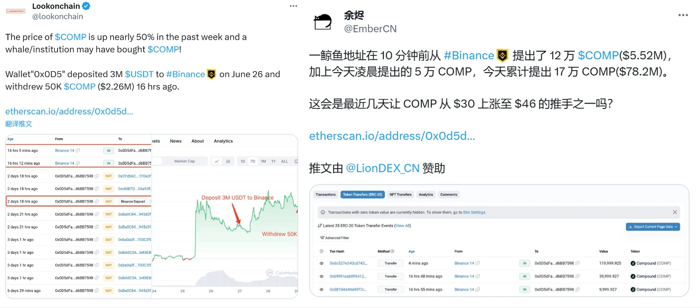 2. 根据 Lookonchain 推特, 6 月 26 日,地址为 0x0D5 的用户向币安存入 300 万美元,并在两个小时内提取 226 万枚 COMP 代币,疑似机构进场。根据推特博主余烬所观测, 6 月 29 日,同样地址为 0x0D5 的用户从 Binance 提出了累计 17 万枚 COMP。借由这两位链上分析博主的观察,也从一定角度明示或暗示机构在进场。