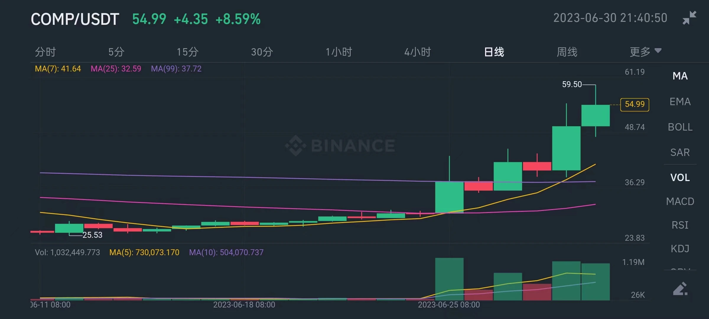 从今年 6 月 17 日到 6 月 30 日,作为 DeFi 1.0 龙头的 Compound 从 27 USDT 一路升到最高点 59.5 USDT。尤其是 6 月 25 日到 6 月 30 日这六天,最大涨幅约在 100% 。如下图: