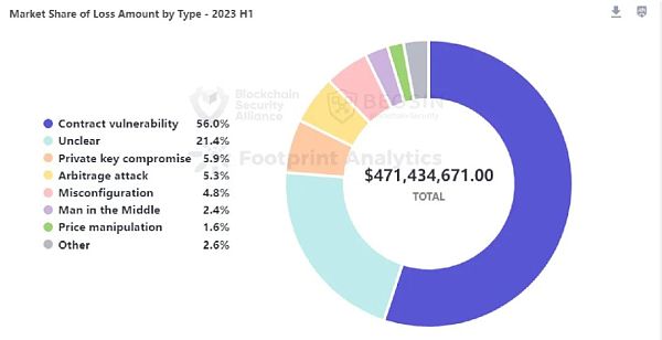 2023 年上半年,攻击原因最频发、造成损失最多的攻击手法为合约漏洞利用。60 次合约漏洞事件造成损失 2.64 亿美元,占所有损失金额的 56% 。