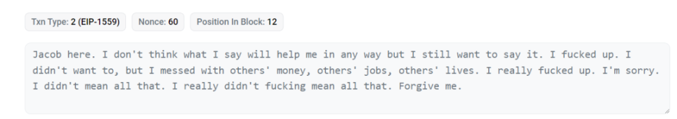 从 3 月 18 日开始至 4 月 4 日,攻击者开始陆续返还资金。期间攻击者通过链上信息进行道歉,称自己「搅乱了别人的钱,别人的工作,别人的生活」并请求大家的原谅。