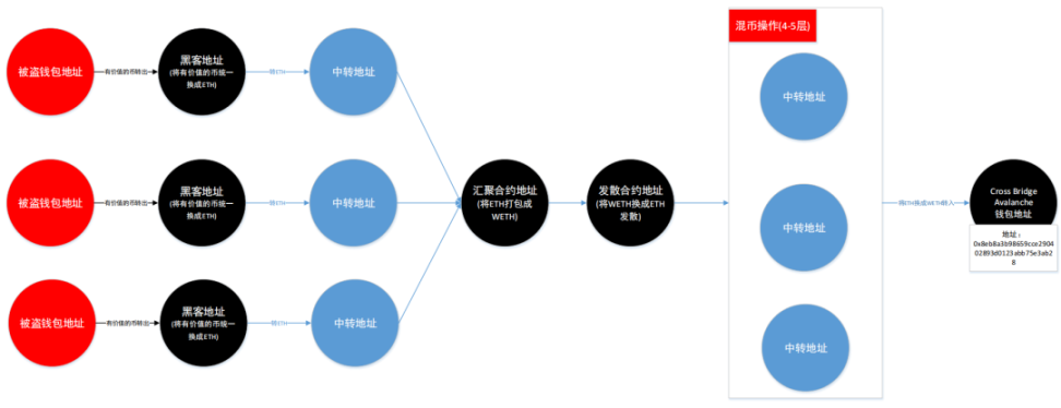 该合约地址会通过两层中转将 ETH 打包成 WETH,再将 WETH 转入用于将 ETH 发散的合约,通过最高 5 层中转转入 Avalanche 用于 Cross Bridge 的钱包地址中进行跨链操作,该跨链不使用合约进行,属于 Avalanche 的内部记账式交易类型。