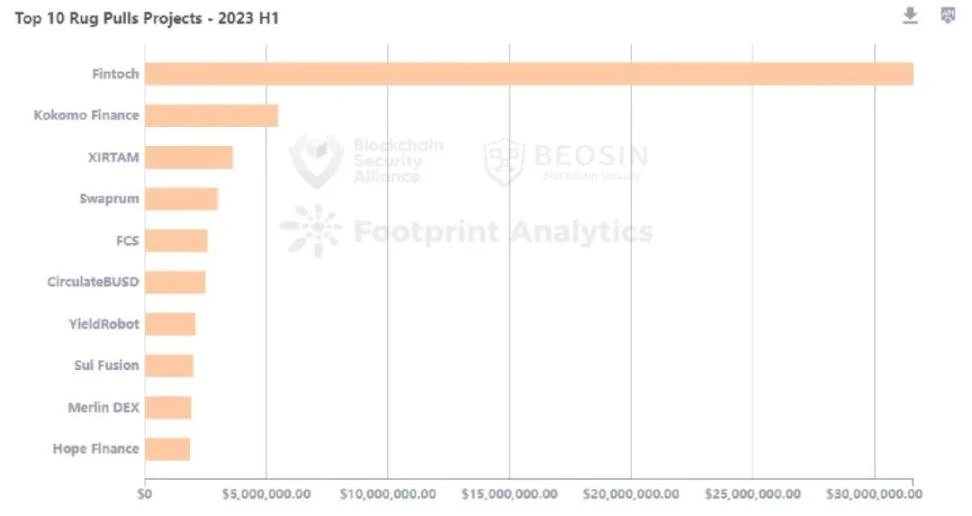 涉及金额最大的 Rug Pull 事件为 Fintoch 项目,该项目卷走了约 3160 万美元的资产。