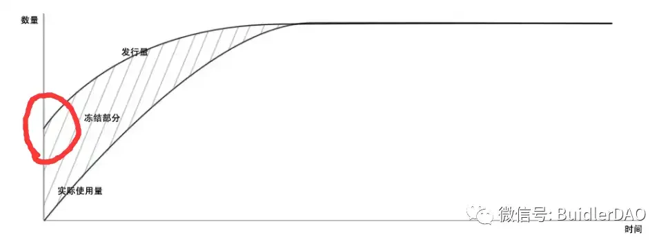 下图是初始总量不为 0 ,需要借助 Token 发行方式筹集资金或更精准的触达用户。以以太坊为代币,是我们研究的 Token 发行方式,如 IC0、IE 0、ID 0 等内容范围,作用范围如图中的红圈所示。对于超出实际应用的 Token 数量,需要使用经济学手段冻结流动性。