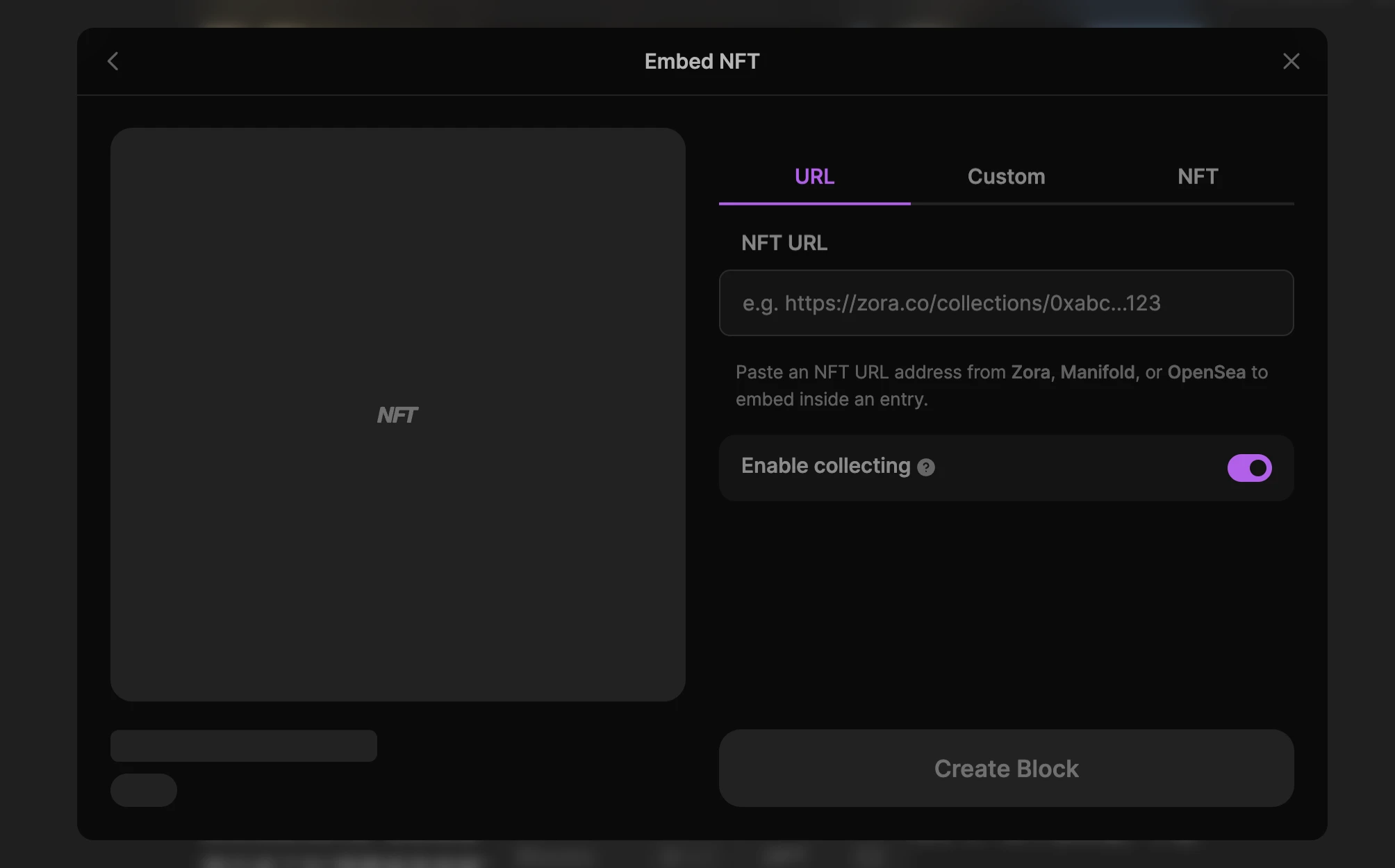将 Zora 、 Manifold 和 OpenSea 等流行 NFT 平台的下拉链接直接粘贴到编辑器中,或通过 NFT 菜单添加合约地址;