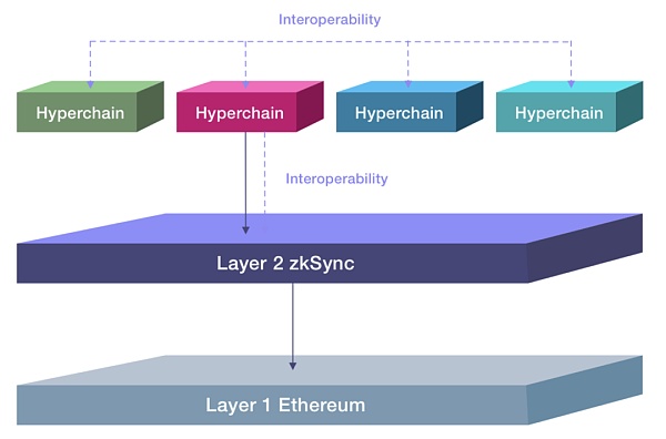 ZKSync关于Layer2的未来演化愿景是Hyperchain(超链) ,超链的结构图看起来似乎和Arbitrum L3有点像,但实质上差别挺大。