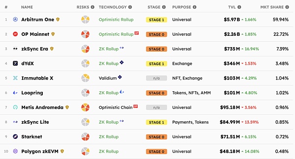 这些明星Rollup项目,除了Scroll之外,其他所有Layer2主网已经陆续上线,从目前TVL排名来看,Arbitrum遥遥领先,TVL在所有Layer2中占比达到60%以上,是当之无愧的Layer2龙头。OP紧跟其后,占比也超过20%。