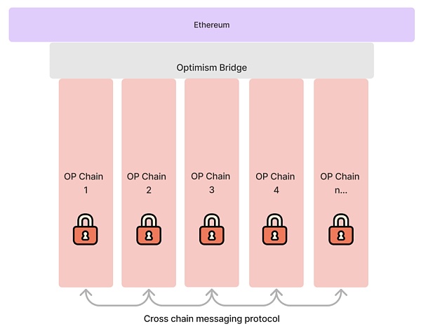 当然,Bedrock只是第一步,OP Stack的下一步是Superchain(超级链), 即基于OP 桥搭建无数OP 链,这些 OP链之间共享安全性、通信层和OP Stack。而且,这些链之间是具备原子跨链可组合性的,即不同OP 链之间可以同时无缝衔接,不需要任何跨链桥或中介通信,来解决链与链之间互操作性的痛点。