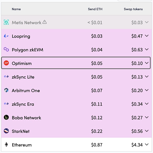 各Layer2交易费用一览(其中Metis Network 数据错误),来源:l2fees