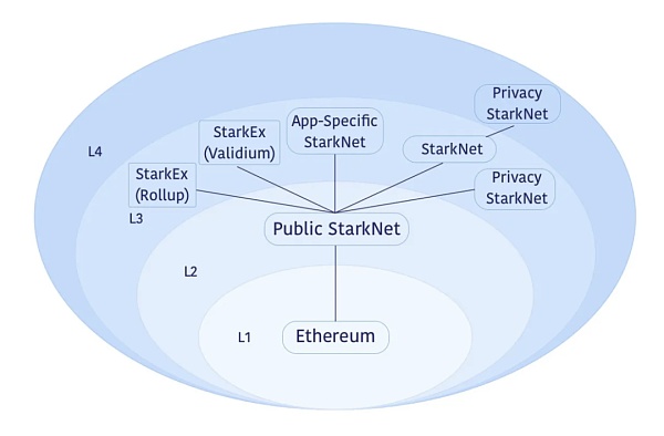 Starknet背后的团队StarkWare,可以说是第一个提出Layer2的多层架构,包括将Layer2作为通用扩展层,Layer3用于定制扩展层等,和上面提到的几个Layer2项目的演进路径大同小异。