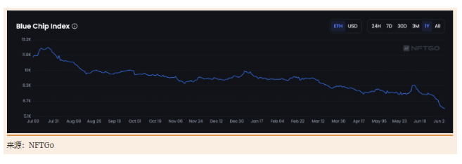 根据NFTgo的数据,蓝筹 NFT 指数在第二季度也受到了打击。蓝筹指数是通过衡量蓝筹 NFT 集合的市值来计算的,以确定其表现。6 月 30 日,价格为 5990 ETH,在此期间下跌了 28%。