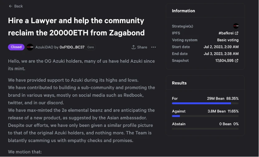 2. Azuki DAO 试图追回了 2 万 ETH 的退款,并将其分配给 DAO,以促进整个 Azuki 社区的增长,并为艺术家、内容创作者和开发者提供奖励和激励。