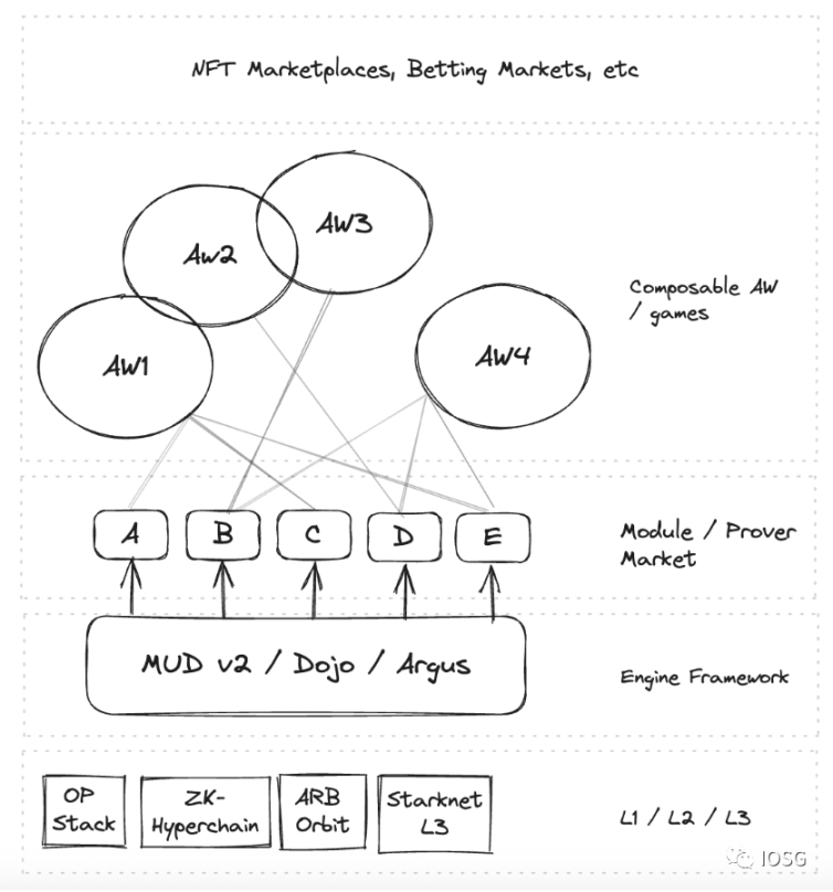 如果我们想象游戏引擎生态系统的进化,它们的网络效应和价值累积层可能如图所示。模块 / 验证器市场很容易被类似于 Gnosis Safe 模块的引擎层吞没。默认情况下,AW 层是可组合的,但这取决于游戏开发者和玩家对可组合性级别的选择。许多公司正试图在这个堆栈中捕获 2 层或更多的层。