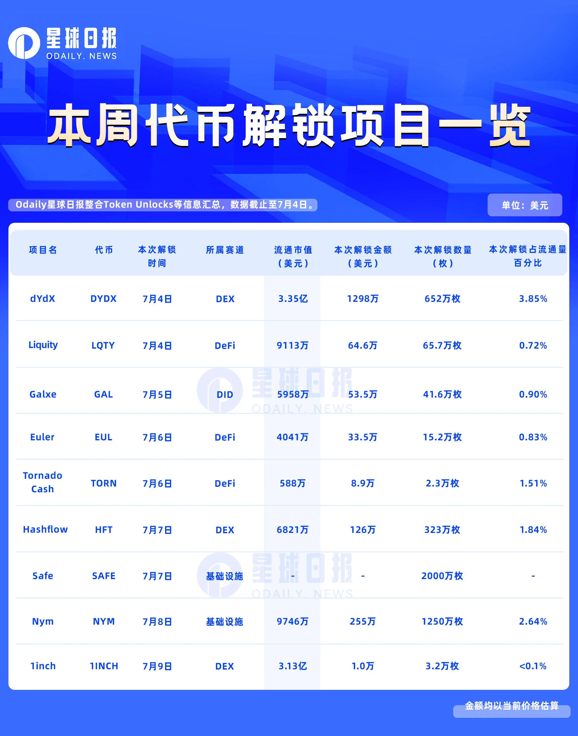 其中,DYDX、 TOR 、HFT、NYM 将面临大额解锁,LQTY、GAL、EUL、1INCH 则面临着小额解锁。而 SAFE 的解锁最为特殊,目前 SAFE 代币尚未开放交易。Odaily星球日报将在下文中一一详述。
