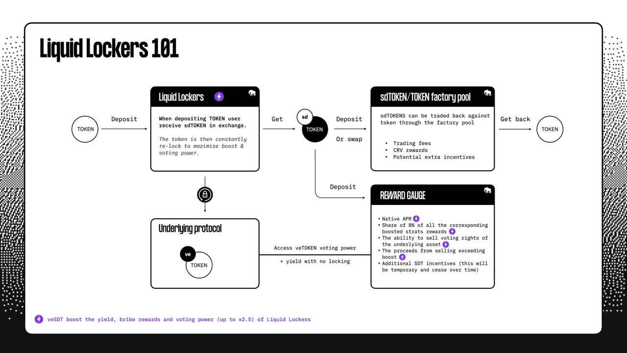 使用 Liquid Lockers,用户可以将原生 Token 锁定在 Liquid Locker 中并收到 sdTOKEN 作为回报。例如,用户可以通过 Liquid Lockers 锁定其 FXS,作为回报接收 sdFXS Token。每锁定 1 个 FXS,Liquid Lockers 就会铸造 1 个 sdFXS,该架构允许 sdFXS 持有者通过 Snapshot 进行链下投票,每周一次对 Frax 上的 FXS 指标分配进行投票。底层 Token 会在原生协议(例如 Frax)上锁定四年,并永久重新锁定,这种锁定机制可以产生最大的奖励。