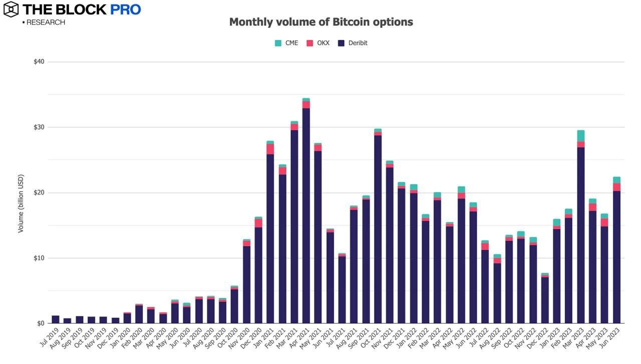 12、在加密货币期权方面,六月比特币期权持仓量和以太坊期权持仓量均有所反弹,其中比特币期权持仓量涨幅达到 46.5% ,以太坊期权持仓量涨幅为 18.5% 。而在比特币和以太坊期权交易额方面,六月比特币期权交易额增加 33.9% 升至 225 亿美元,但以太坊期权交易额则减少了 7.5% ,降至 99 亿美元。