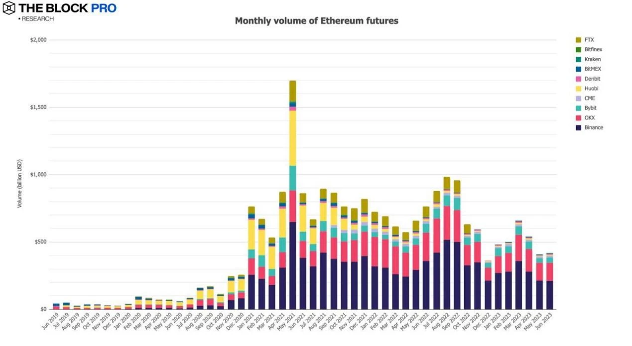 11、六月以太坊期货月均交易额小幅上涨至约 4180 亿美元,上涨幅度为 2.5% 。