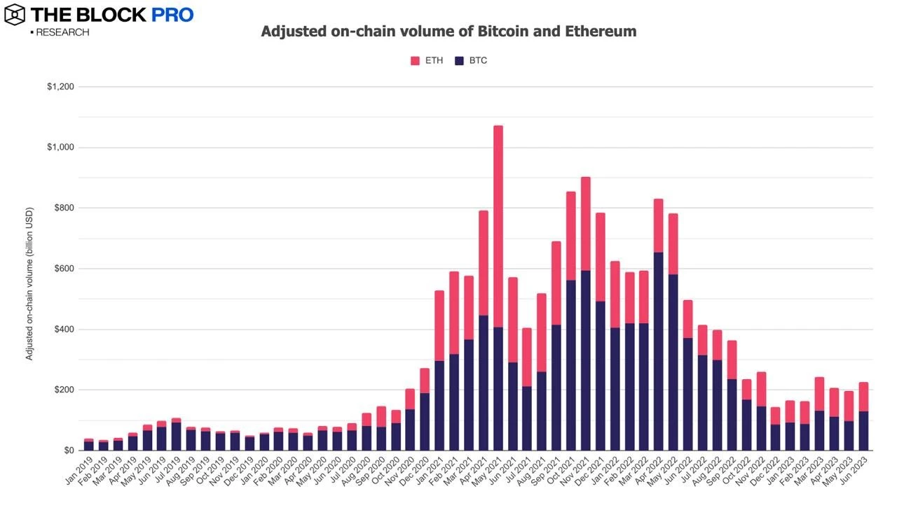 1、六月,比特币和以太坊调整后链上总交易额出现上涨,涨幅为 15.2% ,达到 2260 亿美元,但这一趋势主要由比特币主导,因为比特币调整后链上交易额上个月增长了 32.7% ,以太坊调整后链上交易额则下降约 2% 。