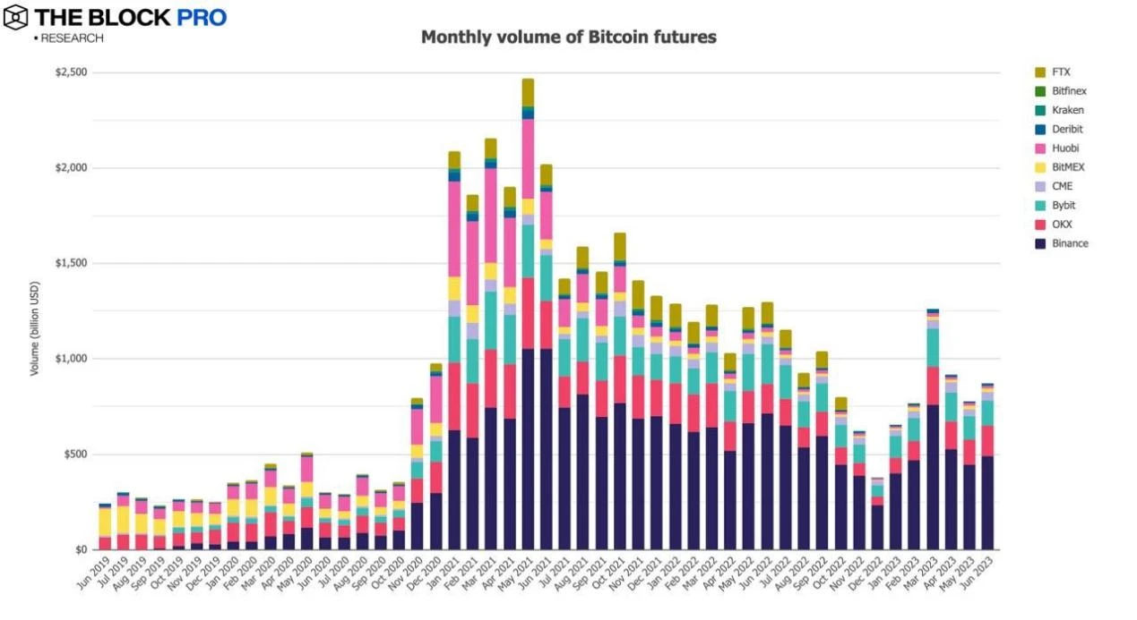 9、在加密期货方面,六月比特币期货未平仓量上涨 21.3% ,但以太坊期货未平仓量却下降了 5.4% ;在期货交易额方面,比特币期货六月交易额上涨了 12.2% ,增长至 8735 亿美元。