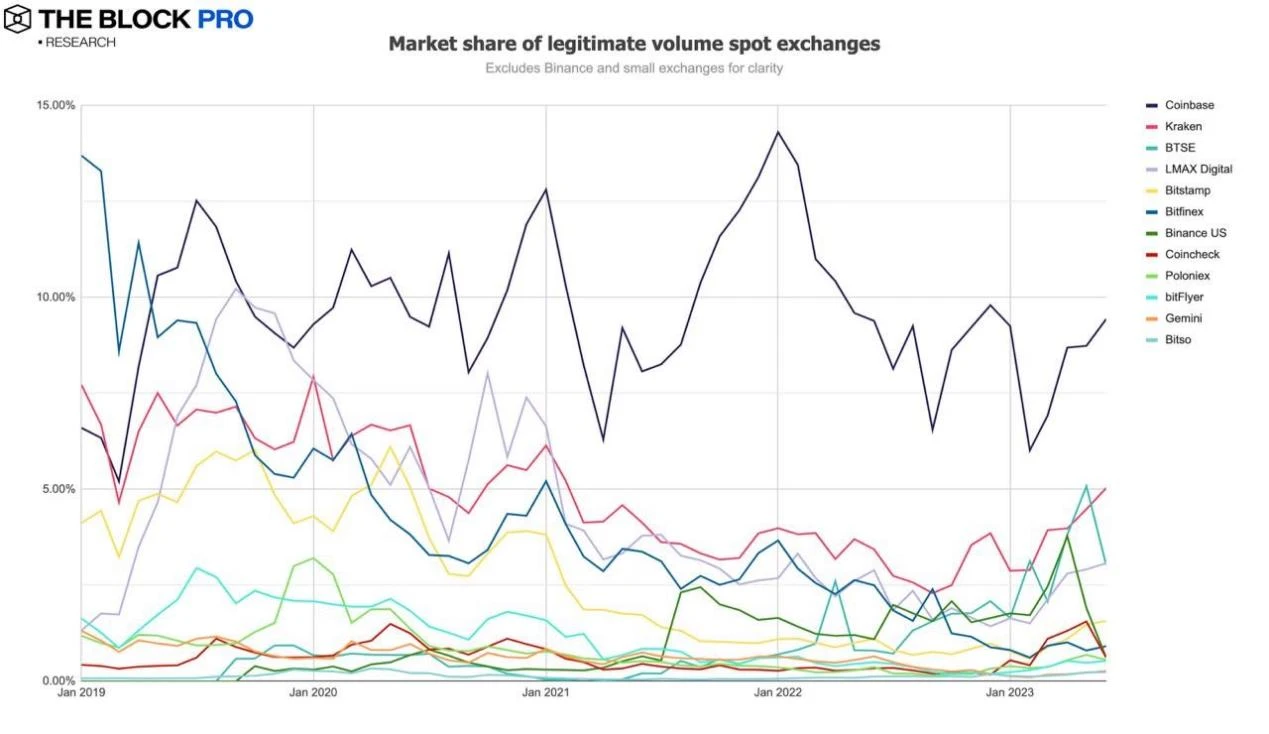 7、六月各大加密货币交易所的现货市场份额排名如下:币安为 73.6% (较五月上涨 2.6 个百分点)、 Coinbase 为 9.4% 、 Kraken 为 5% , BTSE 和 LMAX Digital 均为 3% 。