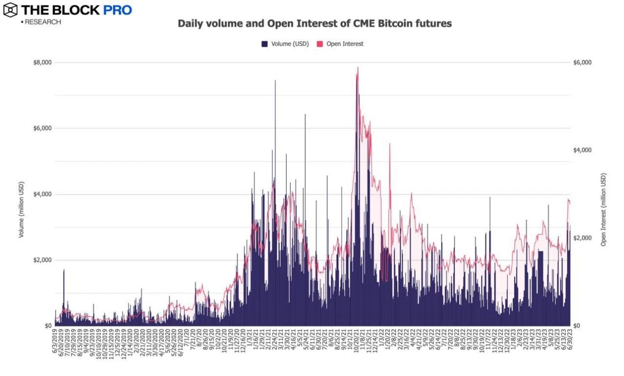 10、芝商所六月比特币期货未平仓量增加了 50.3% ,升至 27.8 亿美元,日均成交金额涨幅为 38.2% ,上涨至约 16.8 亿美元。