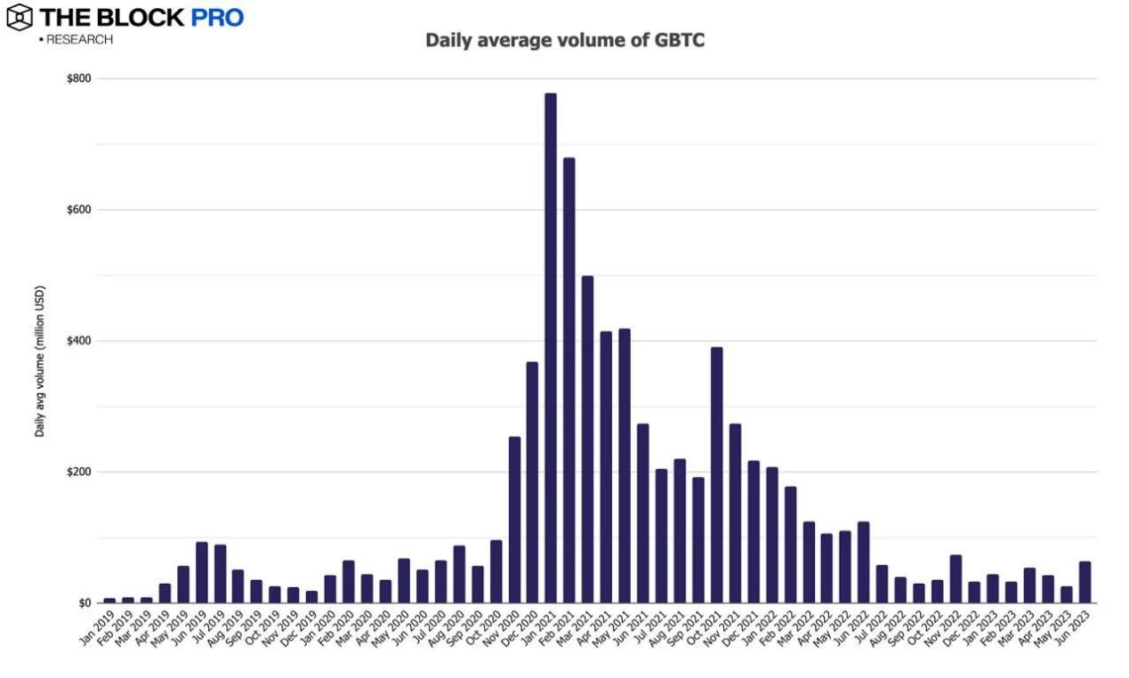 8、灰度的比特币信托基金 GBTC 日均交易额在上个月创下自 2019 年 11 月以来最低水平后,六月份出现了巨大上涨,涨幅高达 143.2% ,升至 6400 万美元。