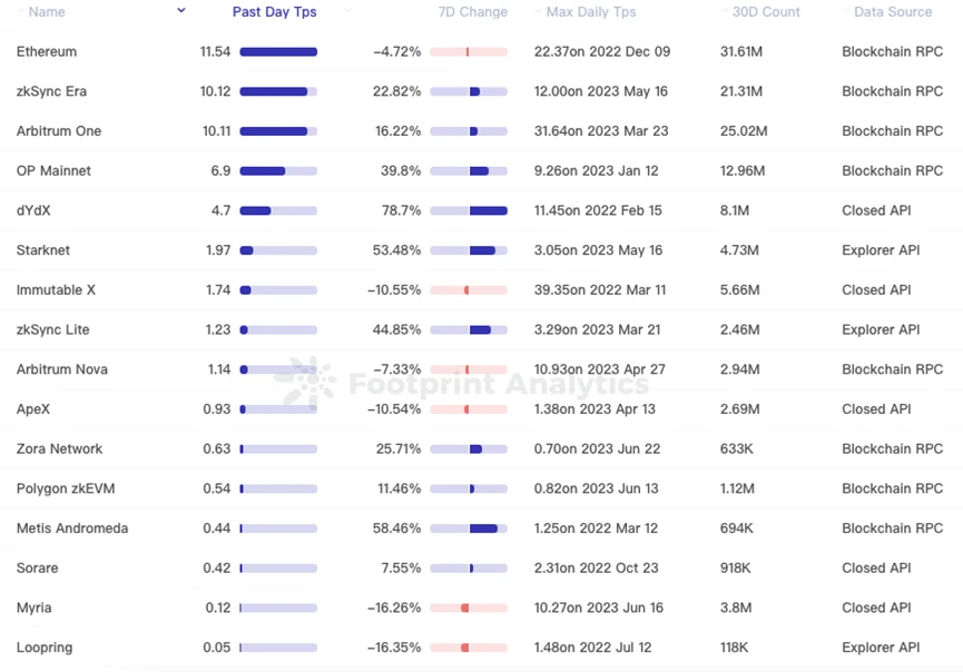 6、Type-4 zkEVM: zkSync Era 主网于 3 月 24 日向所有人开放,目前交互费用较高且以原生项目居多,大多数蓝筹协议还未进行部署。另一个 Type-4 明星项目 StarkNet 在六月进行主网升级,正式激活 Cairo 1 ,更新定序器,改善扩容和交易延迟,但总体使用体验仍有待提高。