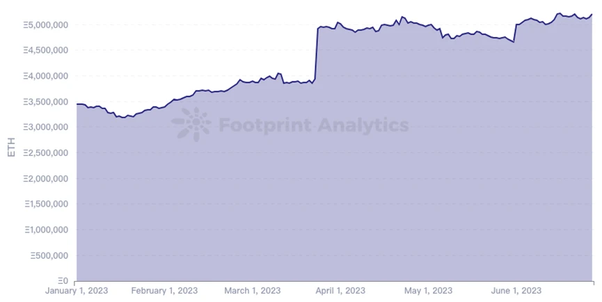 从数据上看,L2以 ETH 计价的锁仓量从年初的大约 364 万增加到了六月中旬的 482 万,交易向L2转移的趋势持续。