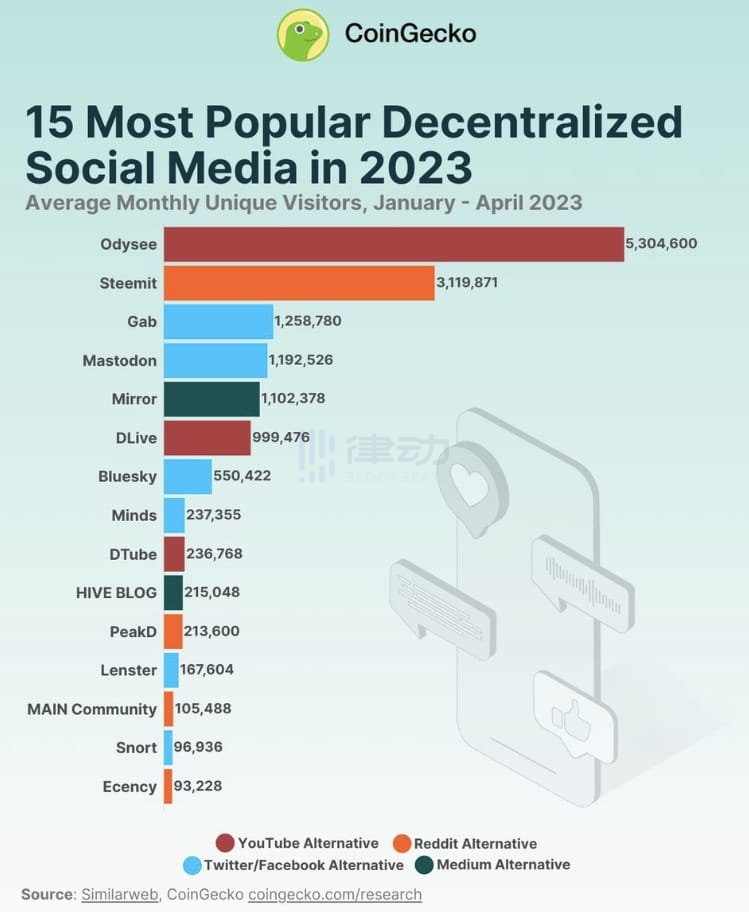 在 CoinGecko 整理的数据图表中,我们可以看到根据 2023 年 1 月-4 月平均每月独立访客数, 15 款最受欢迎的去中心化社交媒体中,Steemit 作为 Reddit 的替代品在独立访客数量上获得了极大的增长,Gab、Mastodon、Bluesky、 Minds 、Lenster、Snort 等作为 Twitter 的替代品在排名上也都靠前。