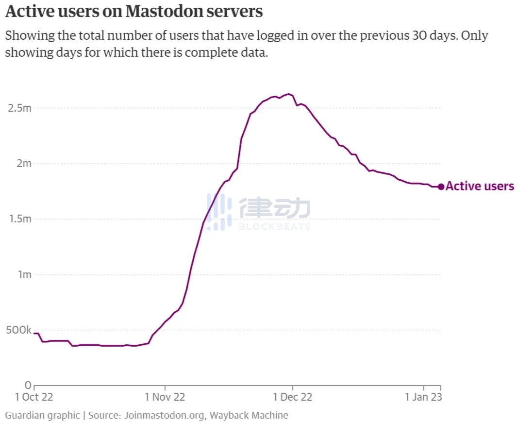 而在 2022 年年底,Elon Musk 大量裁员、修改 Twitter 验证政策造成许多混乱时,Mastodon 涌入了大量用户,高峰时每天新增逾 13 万用户,去年 12 月初活跃用户数达到了 250 万,今年 1 月后活跃用户数下降到了 180 万,但仍然比身为协议的 Lens 和 Nostr 高了一个数量级。