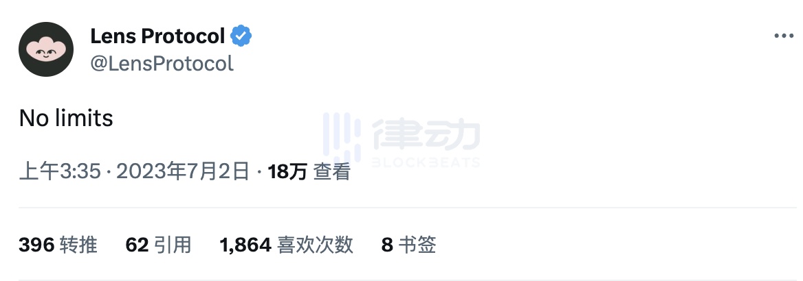 在 Twitter 用户被暂时施加了读取推文的限制后,Lens 协议也意有所指的发布了「No limits」的推文,Lens protocol profiles NFT 的地板价也有所上升。