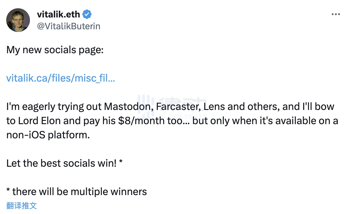 和所有人一样,即使是加密行业的风云人物 Vitalik 也面临着这个问题,去年年底时他在 Twitter 上表示,向 Elon Musk 鞠躬并仍会支付给 Twitter 每月 8 美元的会员费用,但同时他正在急切地尝试一些新的社交平台和协议:其中包括 Mastodon、 Farcaster 、Lens 和 Nostr。