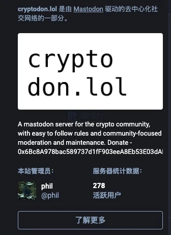 值得一提的是,以太坊基金会成员 boffin Phil Daian 在 Mastodon 上运营了一个名为 cryptodon.lol 的加密社区,Vitalik 也已加入其中。