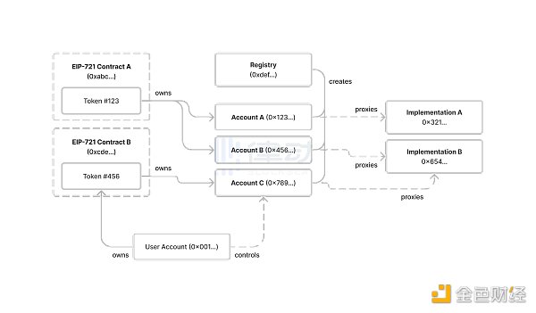 以该流程图为例,某 ERC-721 系列的 Token #456(如 BAYC #456)的持有者通过与「注册 (Registry)」合约交互,从而拥有了 0x789... 这个 Token 绑定账户。注册合约不可变、无需许可且没有所有者,为每个 ERC-721 Token 部署唯一的、确定性寻址的智能合约账户。账户的控制权仅为 ERC-721 Token 持有者所拥有,当 ERC-721 Token 的所有权发生转移,账户的控制权也随之发生转移。