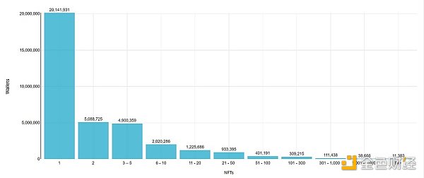 -代币采用速度超过了 NFT 采用速度,891 万个钱包保持 100 美元的余额,只有 5.91M 持有超过 5 个 NFT。