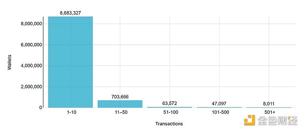 860 万用户参与了 1-10 笔交易,表明偶尔或不频繁的用户占主导地位。该组可能包括: