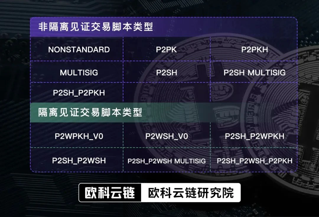 需要注意的是,在进行脚本类型解析时,我们首先要判断交易是否为隔离见证交易。如果是隔离见证交易则需要对 Witness 信息进行解析。以下为常见的非隔离见证交易脚本和隔离见证交易脚本列表: