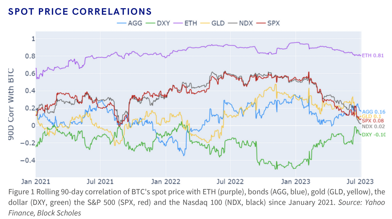 博链财经BroadChain获悉,7月5日,据CoinDesk,根据 加密货币 衍生品分析公司BlockScholes追踪的数据, 比特币 现货价格变化与华尔街科技股指数、纳斯达克指数以及更广泛的指数、标准普尔500指数变化的90天滚动相关性已降至接近于零,这是两年来的最低水平。