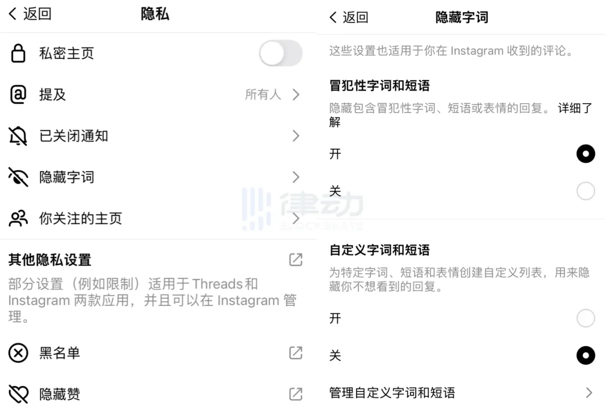 一些在 Instagram 上的隐私设置可以 copy 到 Threads 中,同时也增加了自定义限制词,用户有特定不想看到的内容在 Threads 中不会显示。