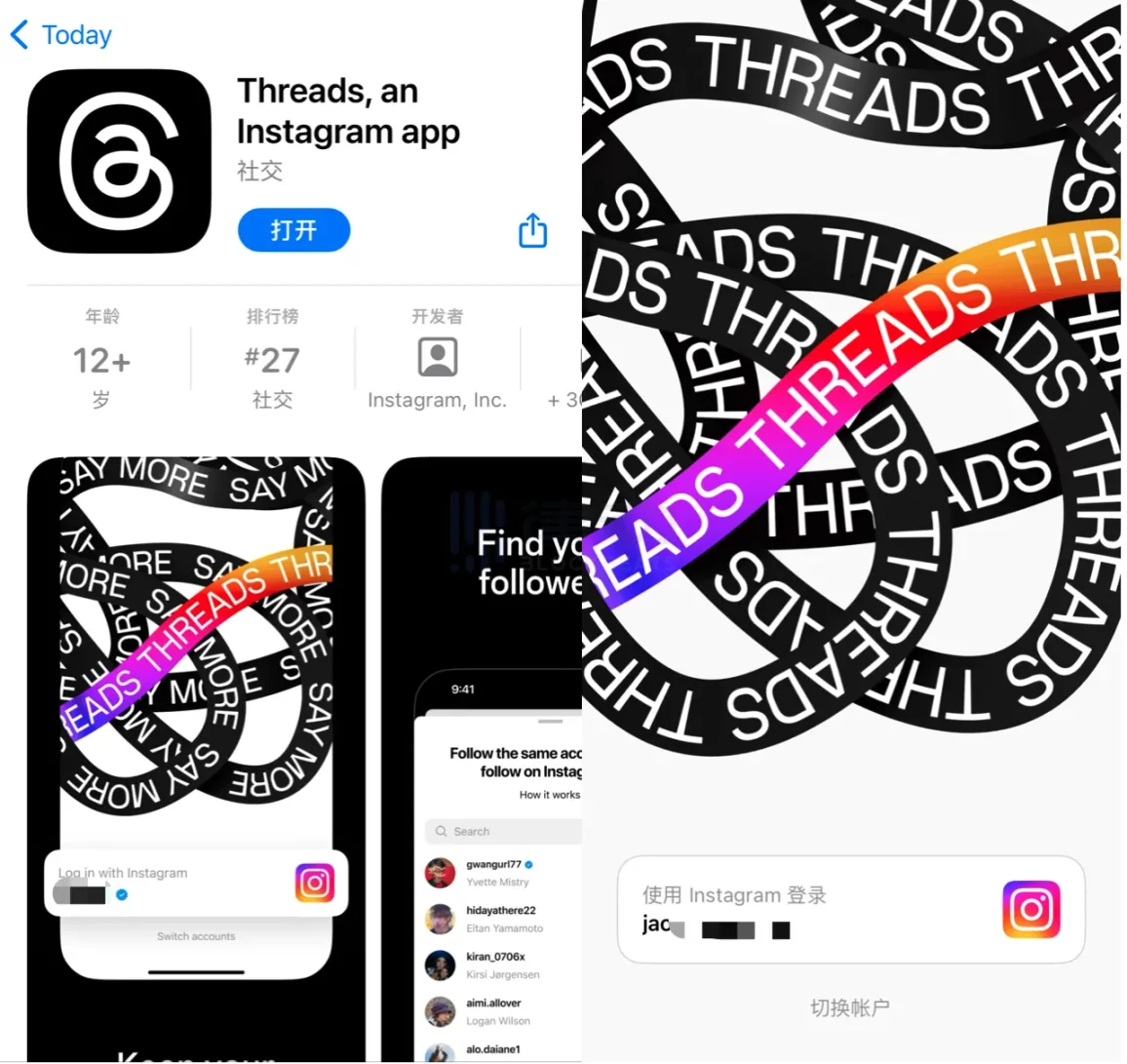 7 月 4 日提前预购下载 Threads 应用的用户可以直接从苹果 App Store 中打开 Threads。进入页面后,若用户已安装 Instagram,则 Threads 会自动识别用户的 Ins 账号,并提供 Ins 账号一键登录。