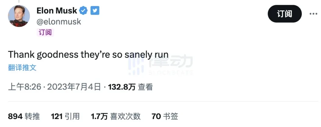 显然马斯克也注意到了这一揶揄,并做出了「谢天谢地,他们运行得如此理智」的嘲讽回击。