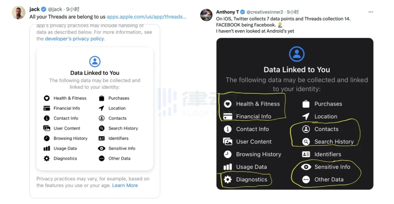但是不少用户和社区成员似乎对 Threads 专业的「sanely run(理智运行)」并不买账。并质疑,「理智运行」是否暗示该应用程序将收集用户所有的数据。在 iOS 版本中,Twitter 收集数据点 7 种,Threads 收集数据点 14 种。