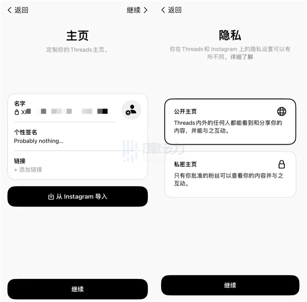 点击继续进入隐私设置页面,与 Instagram 相同,用户可以选择公开或私密化自己的主页。