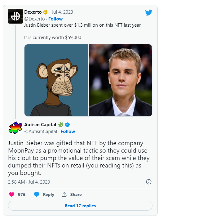 Dexerto 在推文中透露,全球流行巨星贾斯汀·比伯对 BAYC NFT 的 130 万美元投资已贬值至 5.9 万美元;这意味着他损失了约 120 万美元。